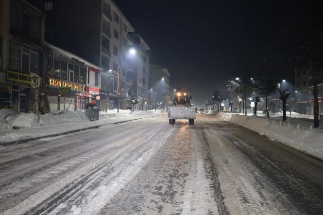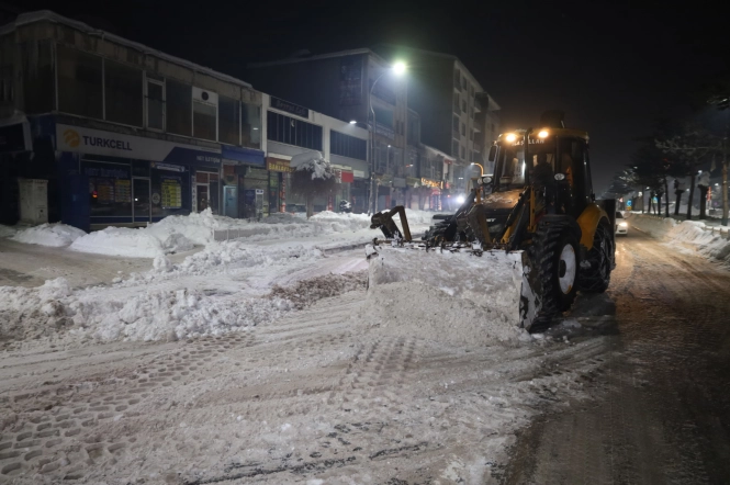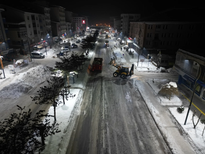Gece saatlerinde de devam eden çalışmalarda; iş makineleri, kamyonlar ve kepçelerle yol kenarlarında biriken karlar toplanarak kontrollü alanlara taşınıyor. Özellikle şehir merkezindeki ana caddeler, kavşaklar ve yoğun kullanılan güzergâhlarda gerçekleştirilen temizlik çalışmalarıyla ulaşımın güvenli ve kesintisiz şekilde sağlanması amaçlanıyor.